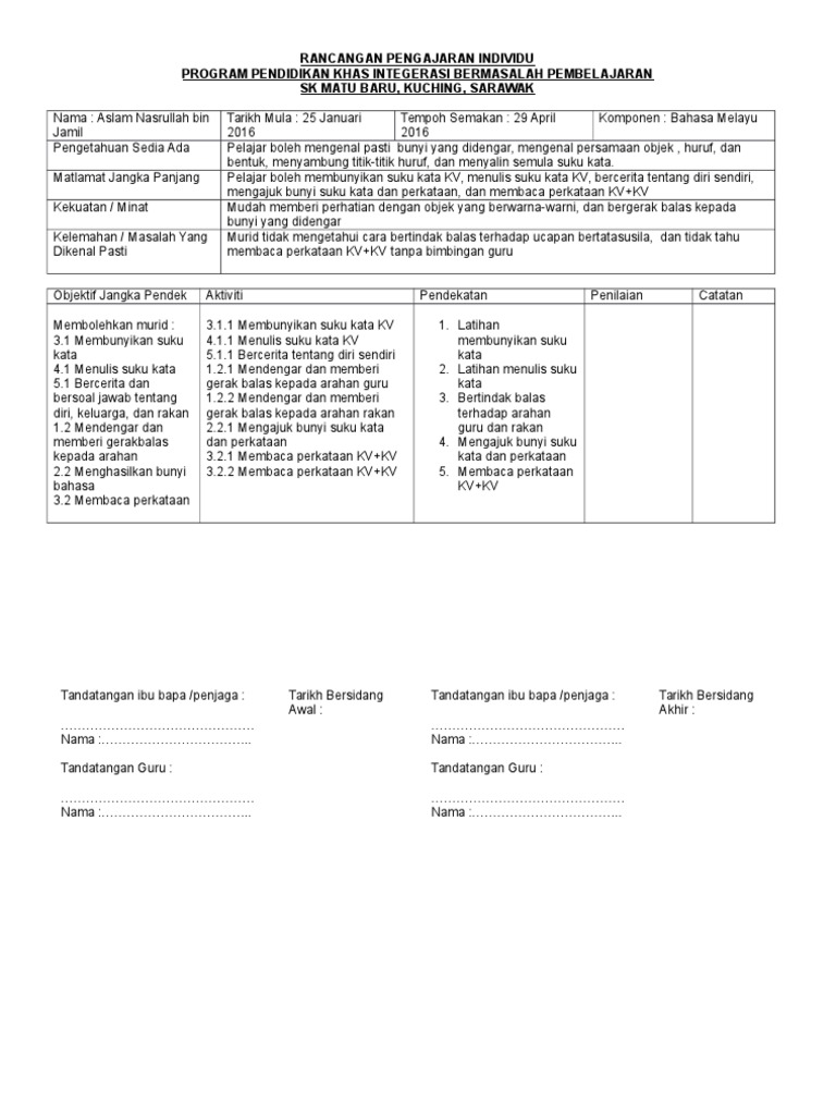 Contoh Rancangan Pengajaran Individu Pendidikan Khas Bahasa Malaysia Tahun 2 Kssr Pdf